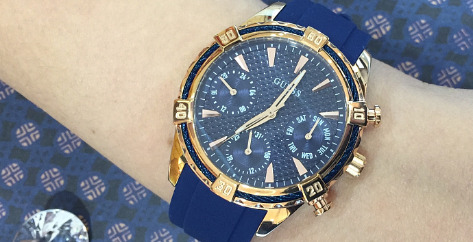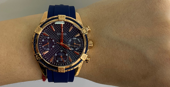 Модель Guess W0562L3 из коллекции Catalina часы в стальном  корпусе с IP покрытием на силиконовом ремешке. Центральная секундная стрелка. На синем циферблате расположено три дополнительных окошка с информацией о дате, дне недели, формате времени 12/24 (Время может отображаться как в 12-часовом, так и в 24-часовом формате). Минеральное стекло.Точный кварцевый механизм.