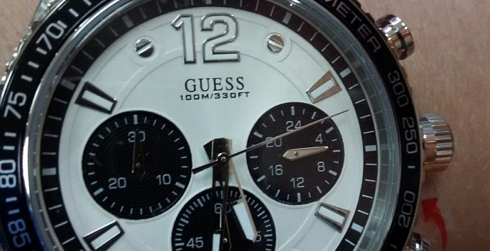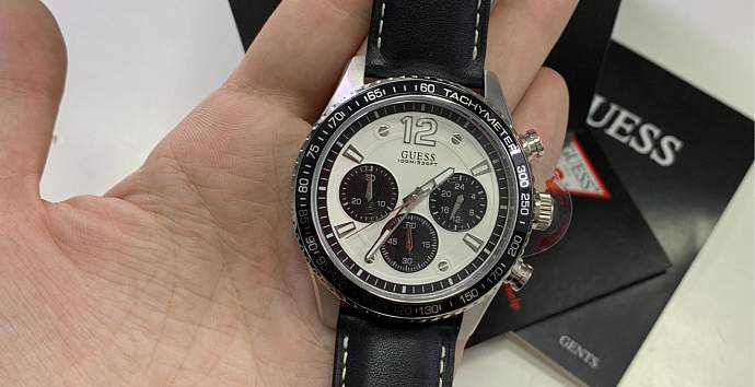 Мужские  наручные часы Guess из коллекции Fleet W0970G4 с хронографом и тахиметром, на белом циферблате расположены три дополнительных окошка с секундомером, датой, форматом времени 12/24.