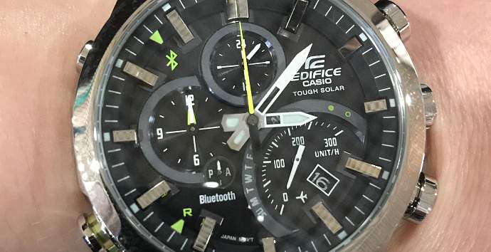 Компания Casio выпустила новую серию аналоговых часов EDIFICE часы EQB-700, которые дополняют линейку часов на основе концепции «Глобальная синхронизация времени». Мужские часы, сочетающие внушительный и современный внешний вид с использованием новейших технологий: Синхронизация со смартфонами по Bluetooth, информация о звонках и email, двойная цифроаналоговая индикация. Подобно своему прототипу, модели EQB-500, новые часы подключаются к смартфону всего одним нажатием кнопки и автоматически корректируют время в соответствии с местом нахождения, а также при необходимости – летним временем. Эти действия выполняются с непревзойденной легкостью путем выбора на мировой карте города, включенного в приложение для смартфонов Casio. Питание от солнечной энергии. Аккумулируя световую энергию, солнечная панель обеспечивает питание для работы часов.Необрит Специальное покрытие обеспечивает длительное послесвечение в темноте даже после кратковременного нахождения на свету.Bluetooth 4.0 модуль Беспроводная технология Bluetooth® 4.0 со сверхнизким потреблением энергии для синхронизации со смартфоном. Часы совместимы с iPhone, Samsung Galaxy Note 3 (>Android 4.2.2). При подключении к смартфону часы корректируют текущее время, а также копируют настройки мирового времени. Поиск телефона. При вызове этой функции, телефон подаст звуковой сигнал, если он находится в зоне действия модуля Bluetooth Полностью автоматический календарь Автоматически учитываются месяцы разной продолжительности и високосные годы.Защита заводной головки